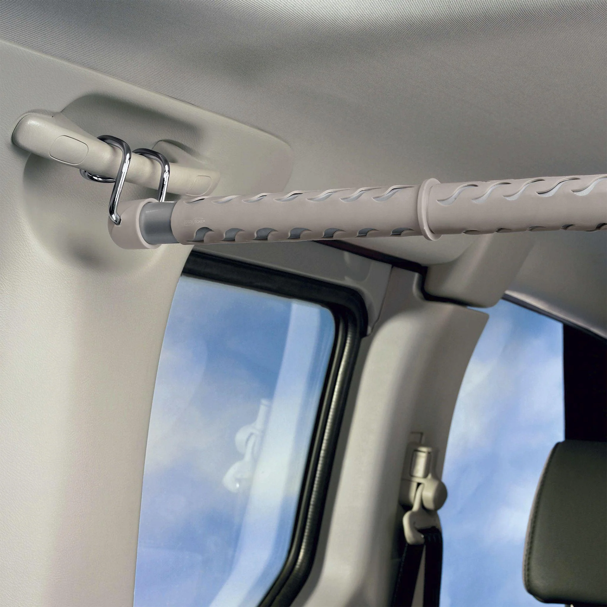 Heavy-duty, metal car clothes bar holds up to 30 lbs. and attaches 2 ways - position end hangers in the down position to hook over grab handles, or rotate upright to hang from ceiling hooks. Perfect for college students, moving, vacationers and cross-country road tours, it expands from 35" to 59" to fit most cars, and features adjustable grip sleeves and dividers to keep clothes from sliding, even on the tightest turns.