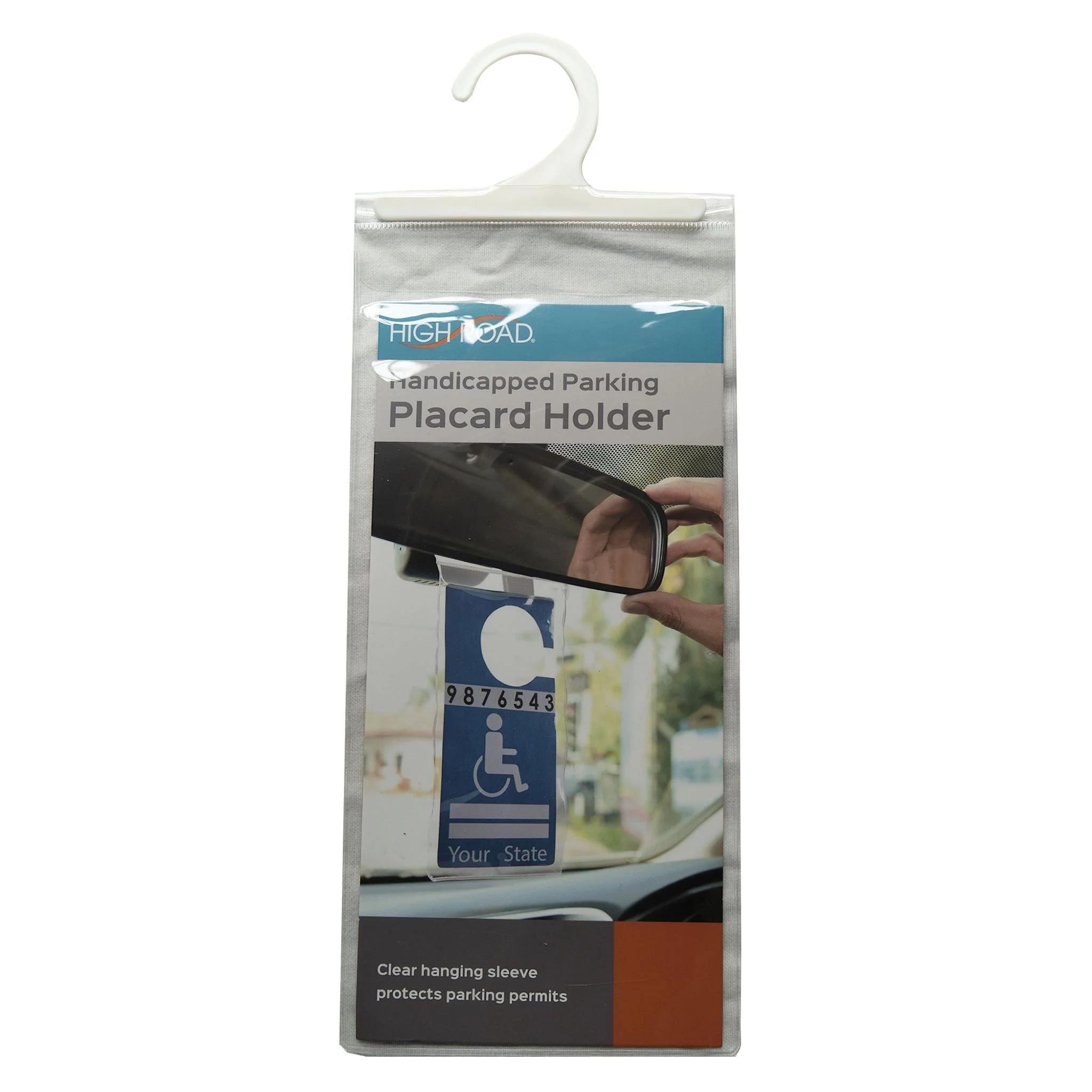 Clear vinyl sleeve protects handicapped permits from rips and stains. Large hanging hook fits mirror posts up to 1" wide. Fits permits up to 9" long and 4.75" wide.
