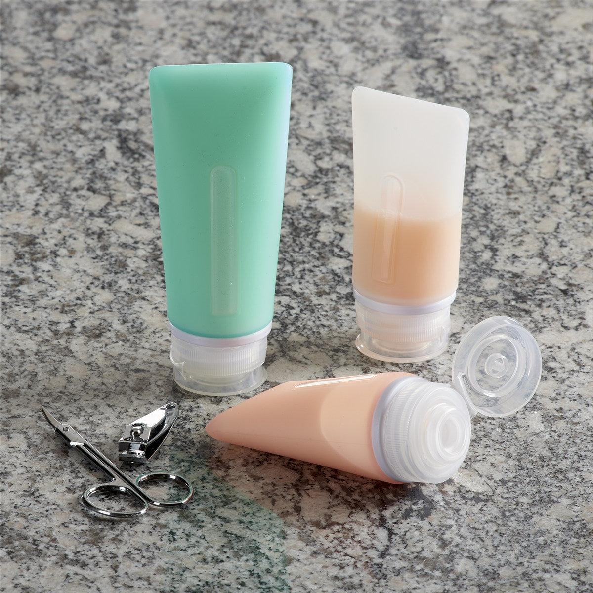 3 oz. durable silicone travel bottles feature a drip-stop spout and fill-level window. Meets TSA 3-1-1 guidelines for carrying lotions and liquids onto the plane. Food grade BPA-free silicone.