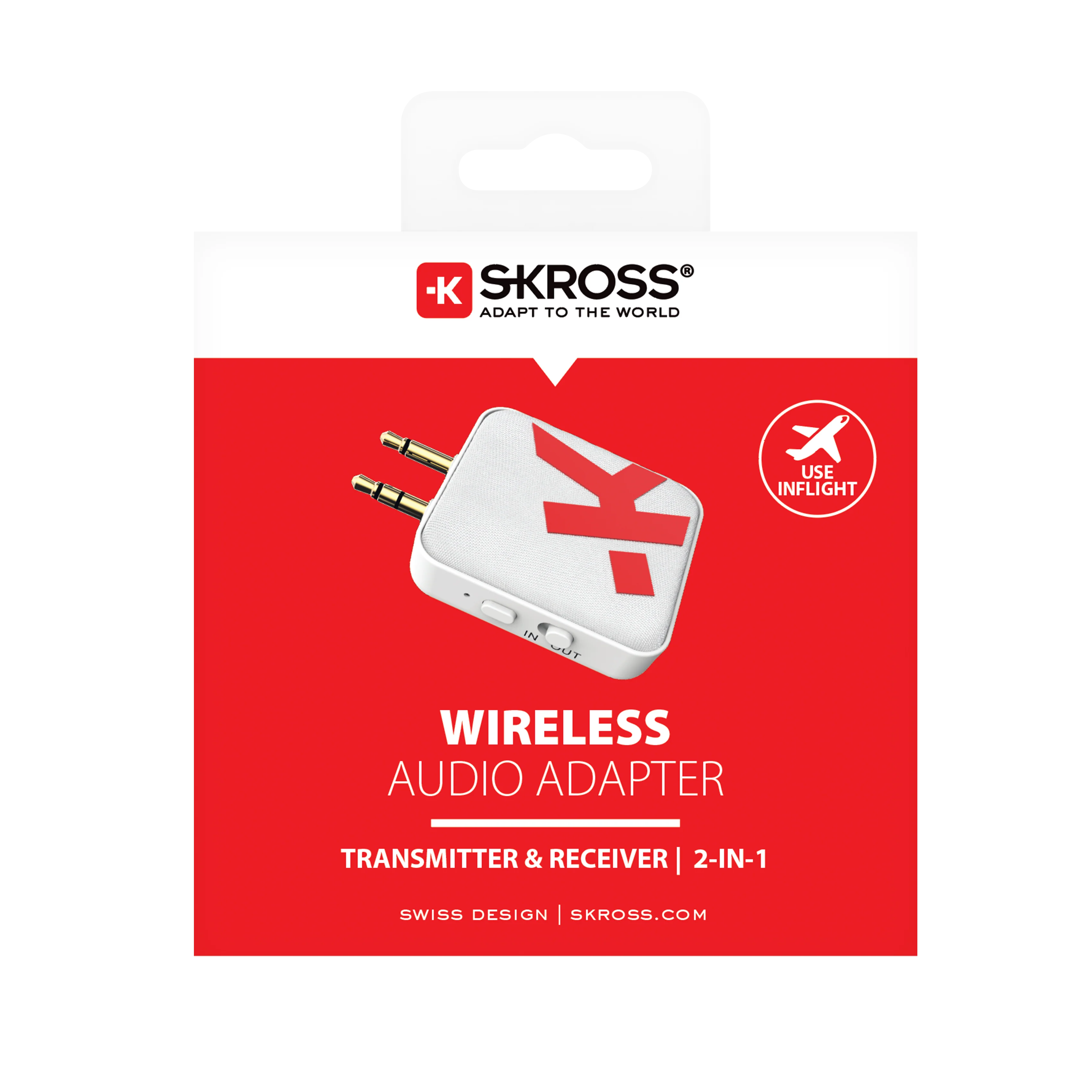 This Wireless Audio Adapter from SKROSS® conveniently connects your wireless headphones or earphones to inflight entertainment, TVs, computers, autos, portable gaming devices, gym machines and more. Provides up to 20 hours of battery life with USB-C charging. The foldable 3.5mm mini jack connectors ensure compatibility with single or dual prong input for ultimate flexibility and compatibility with various devices.
